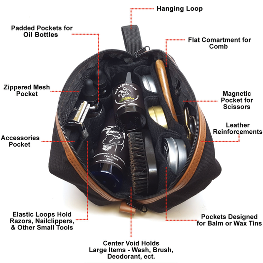 Badass Beard Care product organizers are designed to keep your beard oil, balm, butter, wax, wash, conditioner and scissors clean, organized, and easily accessible. Product Caddies are the perfect option for cleaning up your counter space and maintaining an organized bathroom. Our Unique Canvas Travel Bag is a durable toiletry bag designed specifically to organize grooming & beard care products.