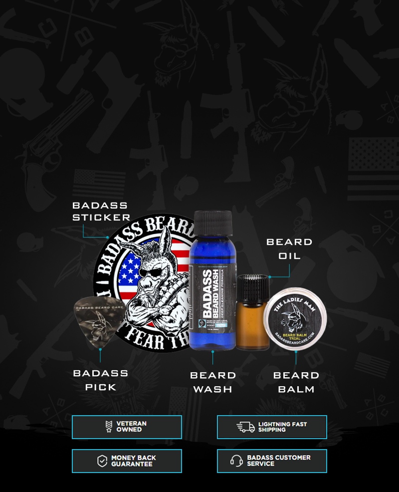 1x Trial Size Oil, 1x Trial Size Balm, 1x Beard Wash, Beard Balm Pick, Badass Beard Care