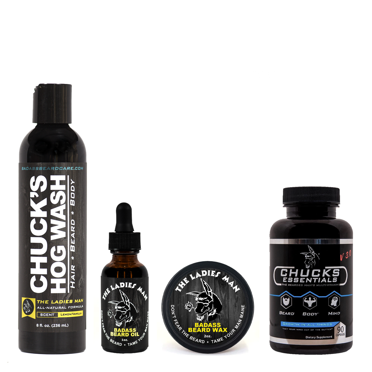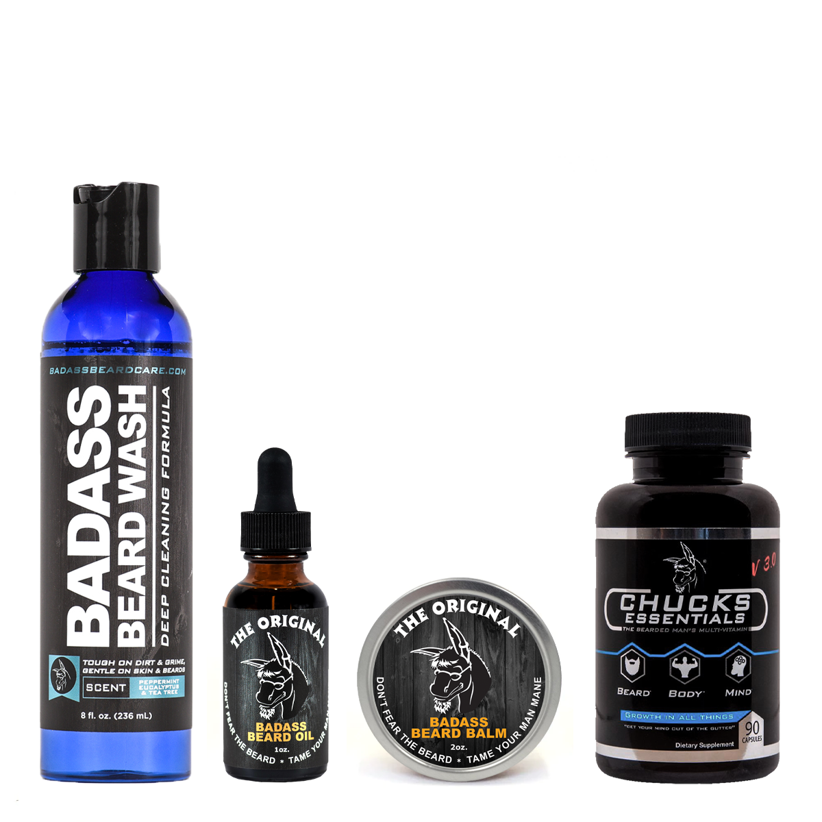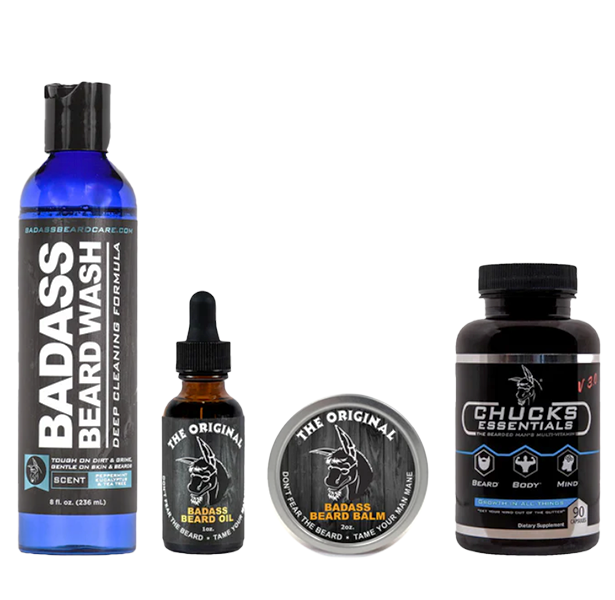 Reach your beard growth potential with our Badass Growth Kit! Get our 8oz all natural Chucks Hog Wash or Beard Wash, a 1oz Beard Oil, choice of a 2oz Beard Balm, 2oz Beard Wax, or 3oz Beard Butter, and a bottle Chuck's Essentials Multivitamin, and a choice of a 2oz Beard Balm, 2oz Beard Wax, or 3oz Beard Butter.