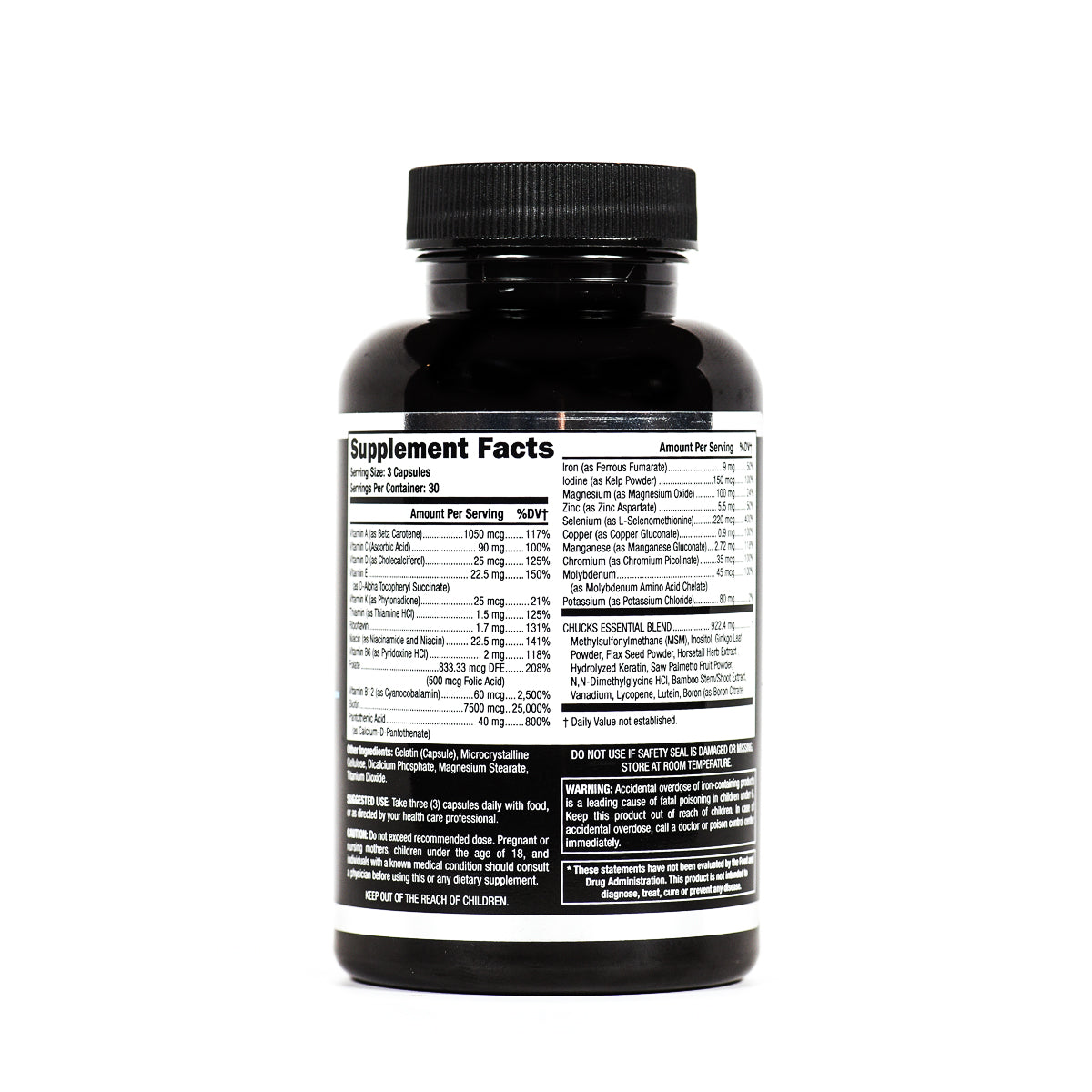Chucks Essentials -Vitamin A, Vitamin C, Vitamin D, Vitamin E, Vitamin K, Thiamine, Riboflavin, Niacin, Vitamin B6, Folate, Vitamin B12, Biotin, Pantothenic Acid, Iron, Iodine, Magnesium, Zinc, Selenium, Copper, Manganese, Chromium, Molybdenum, Potassium, MSM, Inositol, Ginkgo, Leaf Powder, Saw Palmetto Fruit Powder, Hydrolyzed Keratin, Horsetail Herb Extract, Flax Seed Powder, N,N-Dimethylglycine HCL, Bamboo Stem or shoot extract, Vanadium, Lycopene, Lutein, amd Boron.