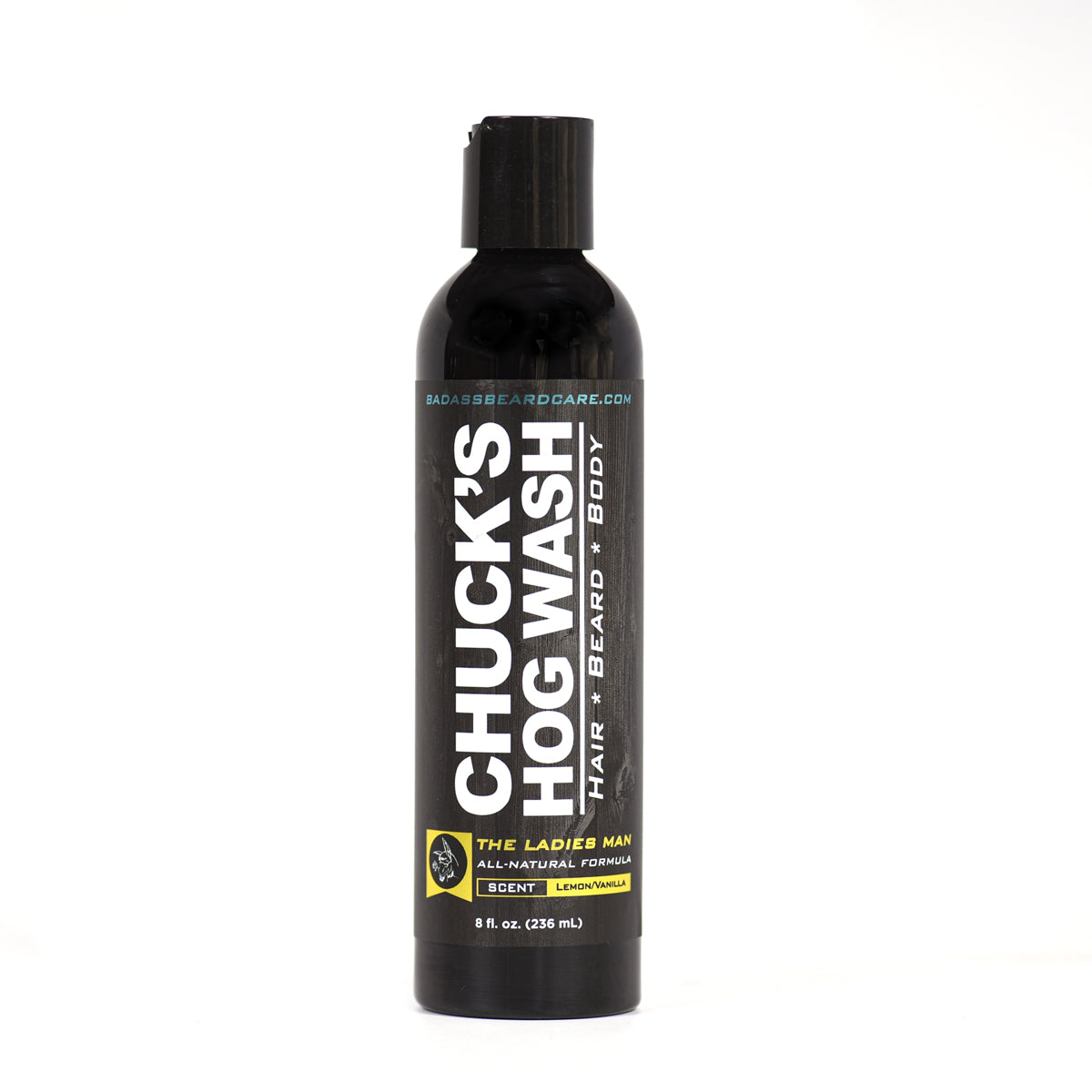 Chuck's Hog Wash is an all natural formula and is available in 14 of our Badass scents that we offer our beard oil and beard balm in! It is an all-in-one wash for the bearded man and can be used on beard, skin, and hair! It's made with 100% natural ingredients to be gentle on hair and skin and leave your beard softer than its ever been and is suitable for daily use!