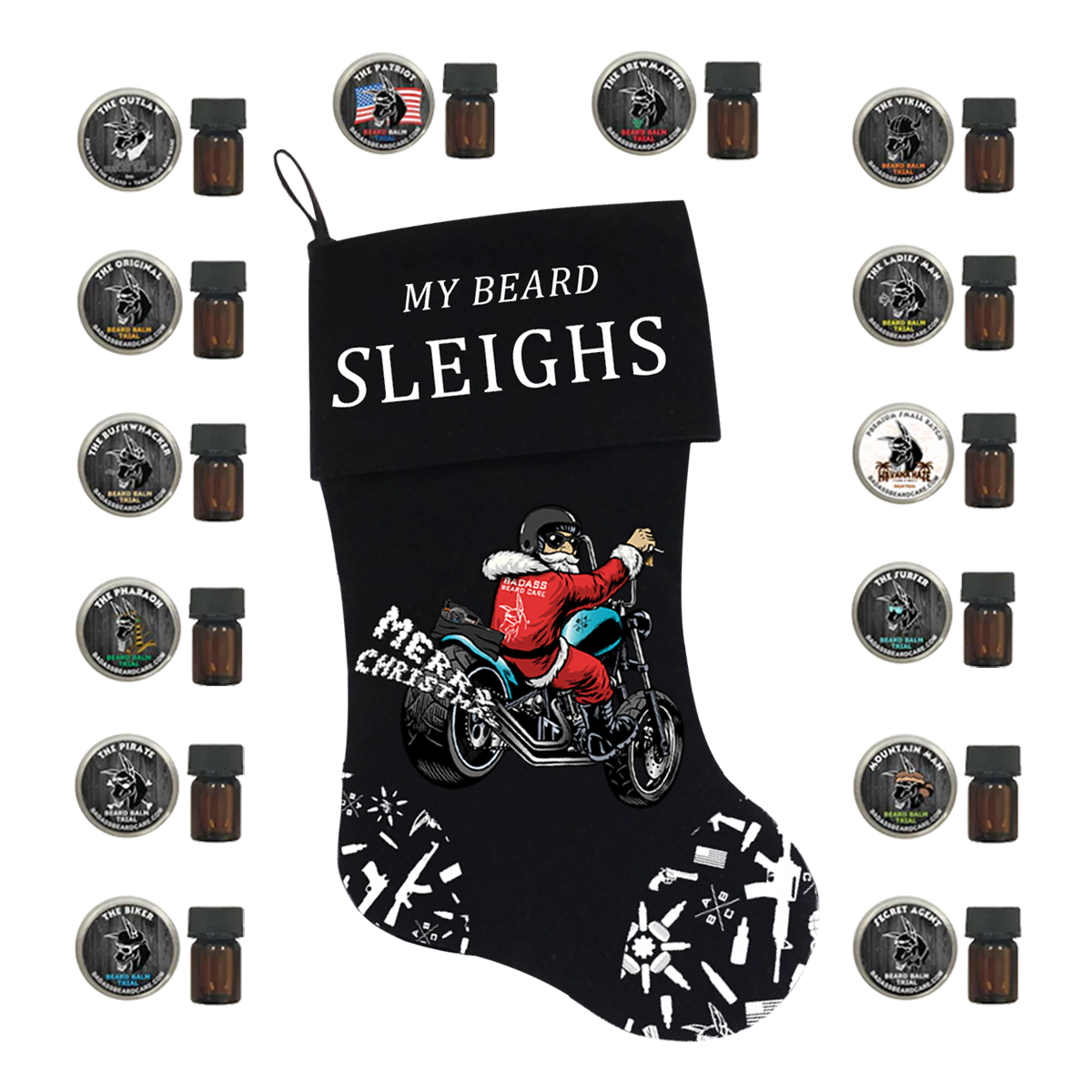 The Ultimate Stocking Stuffer is the perfect gift for a bearded badass in your life. We include 14 Trial Packs (includes oil & balm)so you can experience every scent we offer and a 'My Beard Sleighs' Holiday theme design Stocking ($14.99 value)